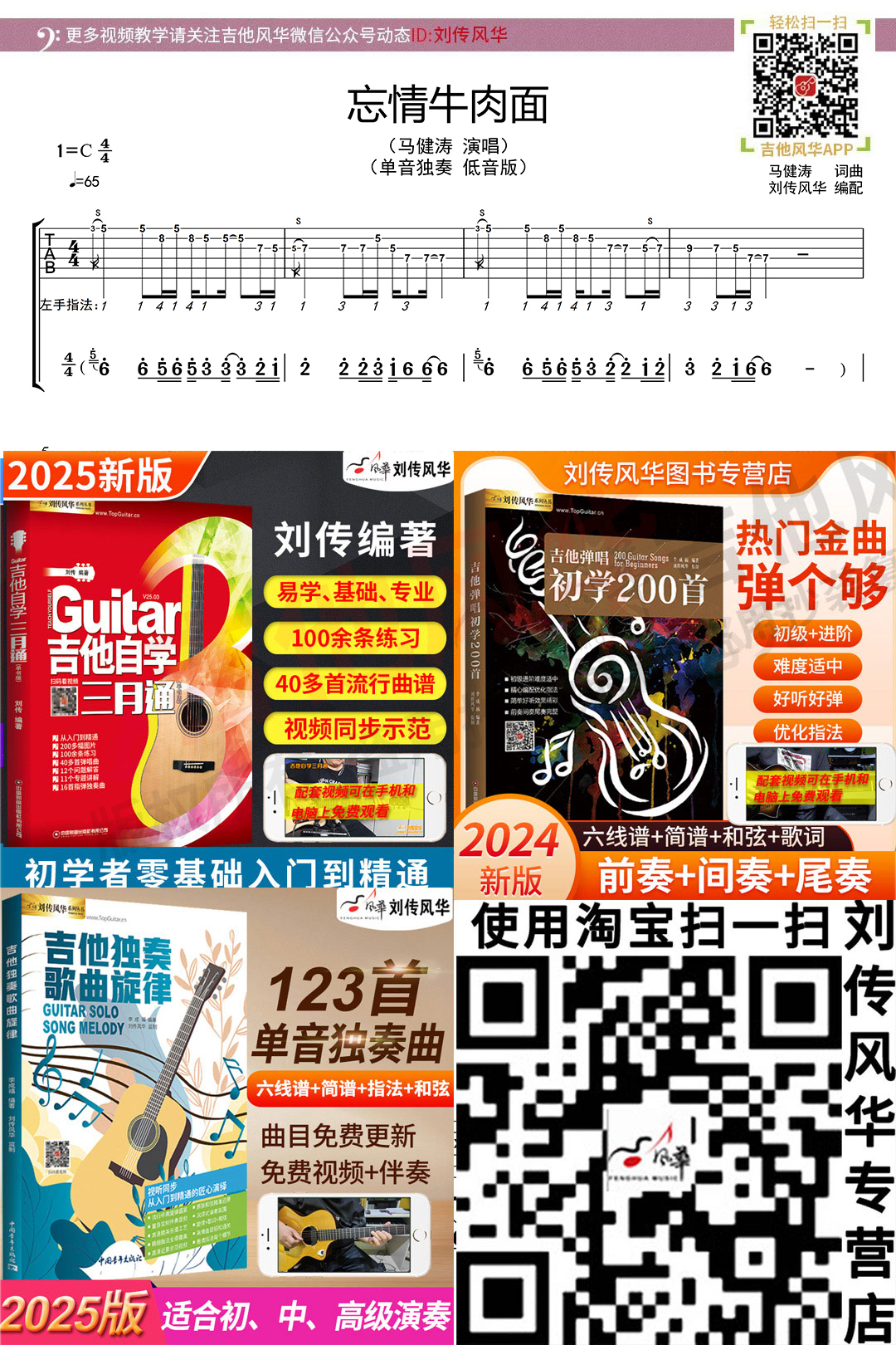木吉他单音(低音版)独奏曲六线谱《忘情牛肉面》