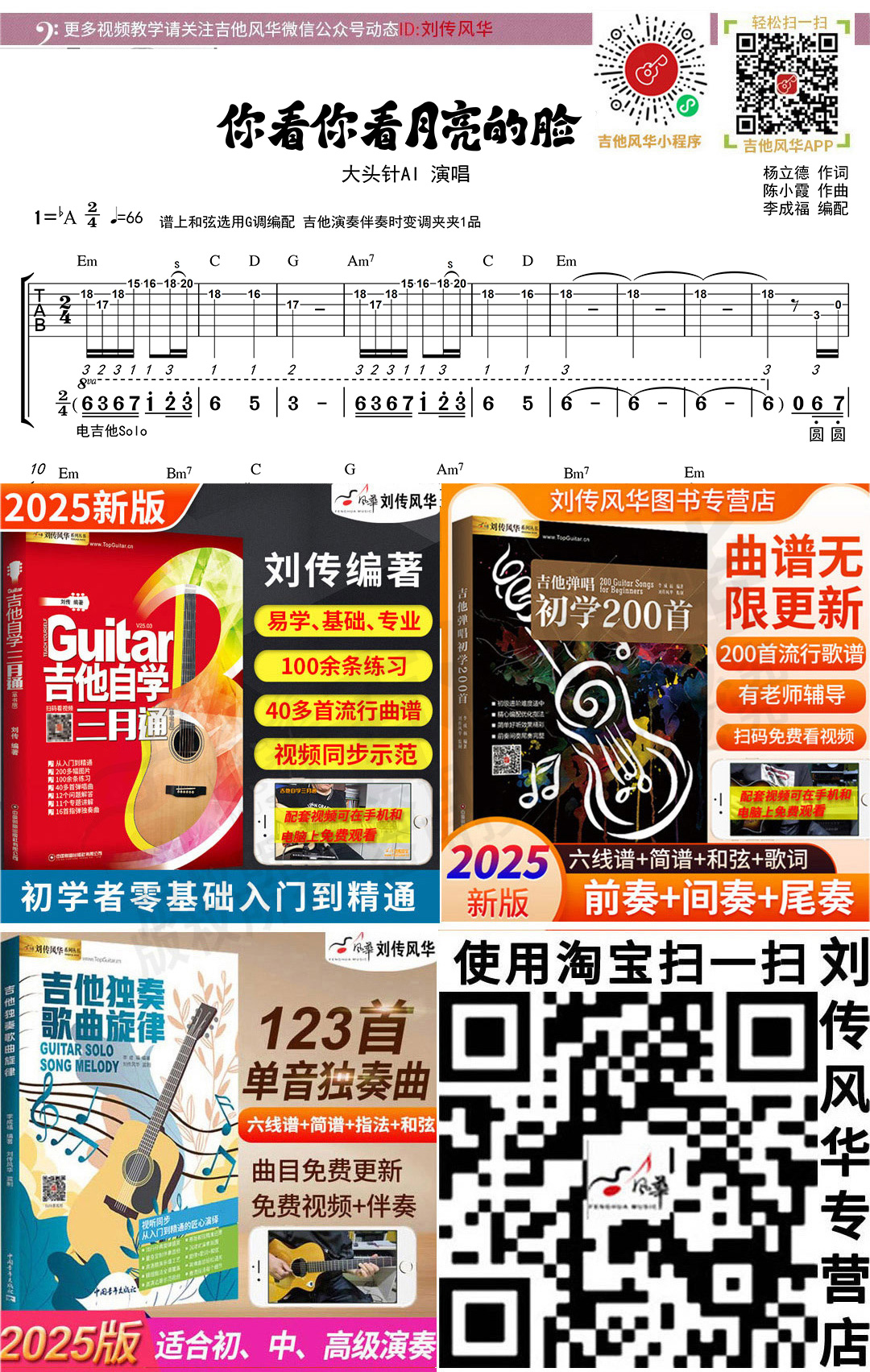 木吉他旋律独奏六线谱《你看你看月亮的脸》大头针版