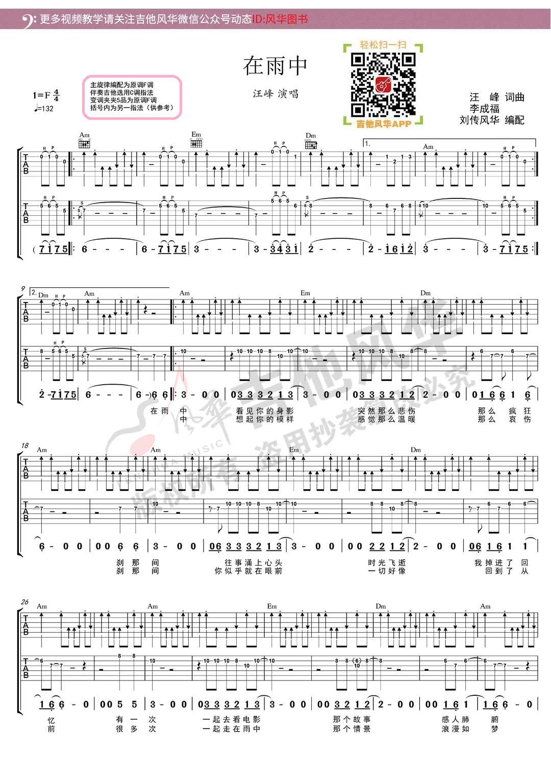汪峰《在雨中》原调solo谱F调+弹唱谱+双吉他谱+伴奏