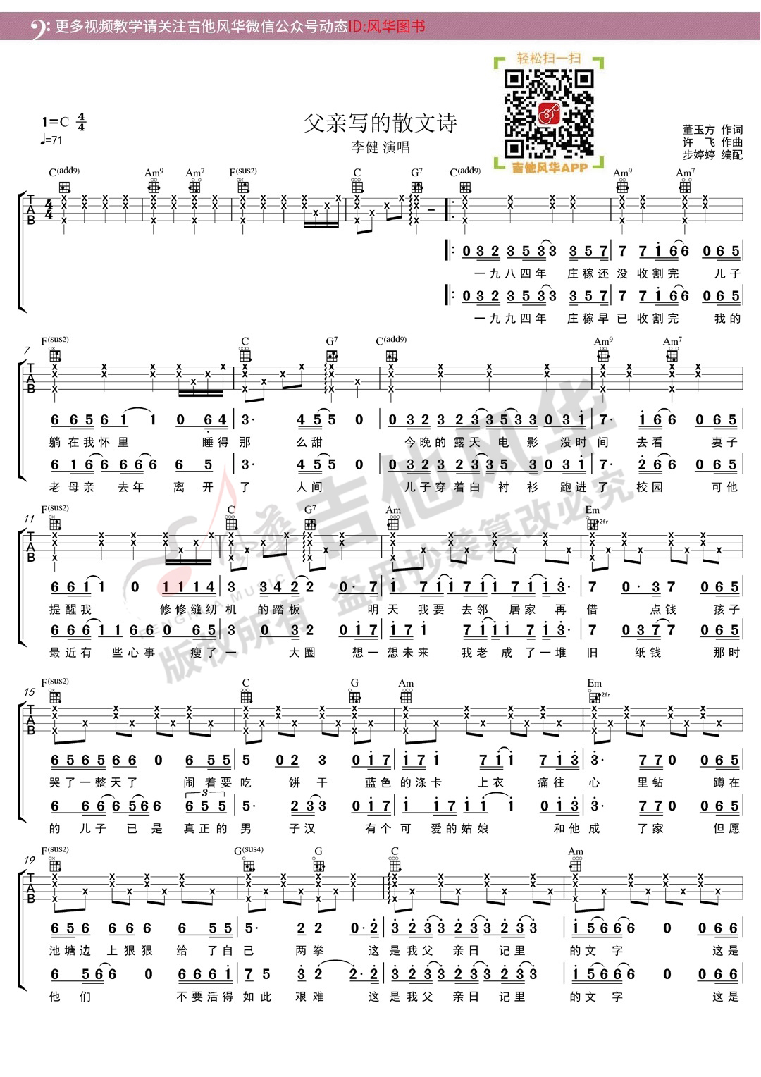 李健《父亲写的散文诗》尤克里里弹唱谱