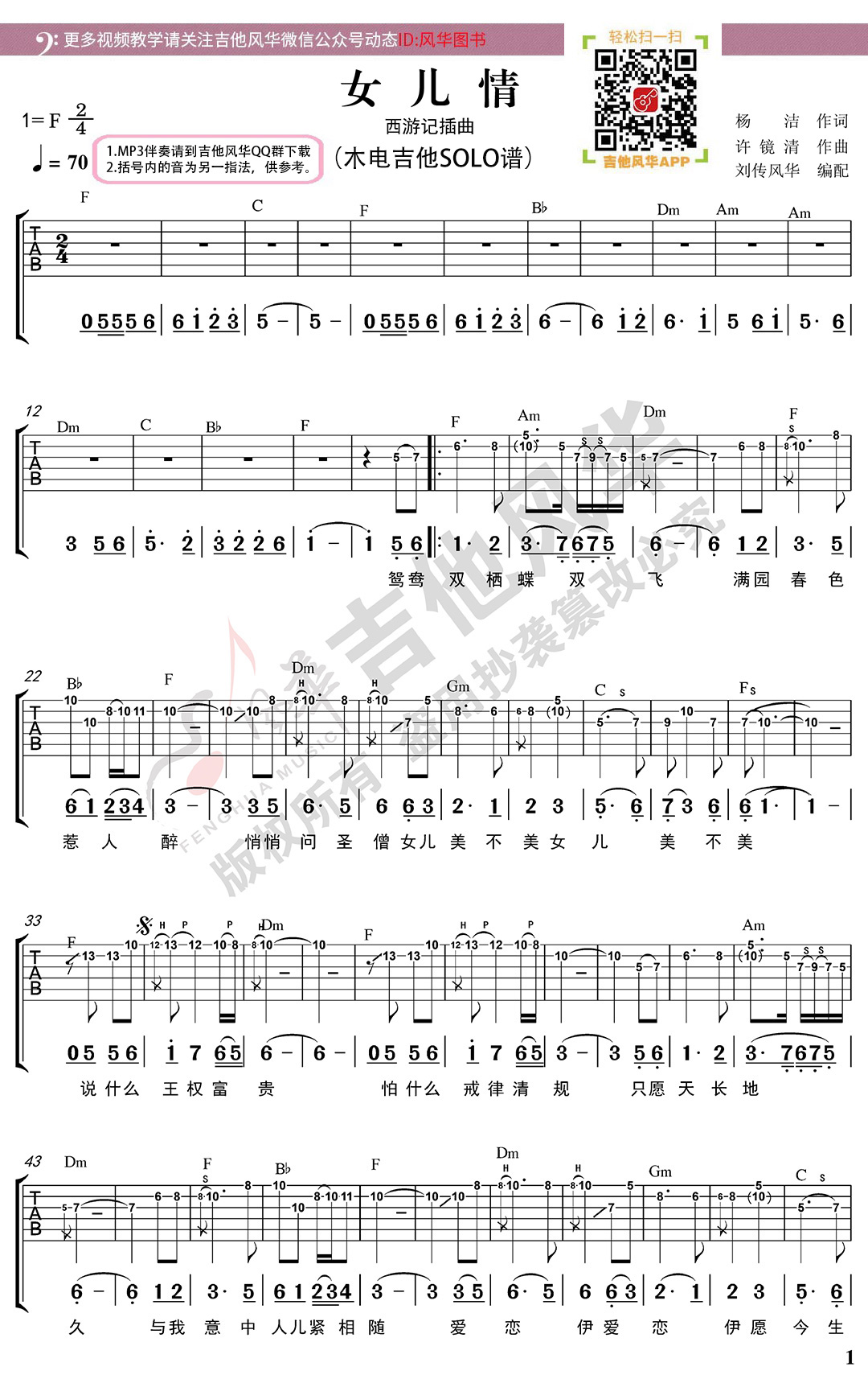 《女儿情》solo谱F调+弹唱谱+伴奏